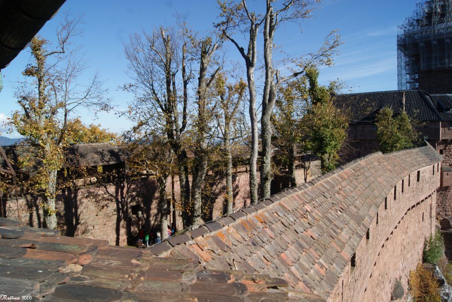 Im Inneren erfahren wir, dass die Burg quasi gar nicht echt ist, sondern rekonstruiert wurde. Na ja erbaut wurde sie schon im 12. Jahrhundert, aber wie das bei Burgen eben mal so ist... sie werden gebaut, zerstört, wieder aufgebaut, niedergebrannt usw. Dieser hier ging es nicht anders, bis die Stadt Sélestat 1871 die Burg an Kaiser Wilhelm II verschenkte. Der Kaiser wollte ein Museum schaffen und so begann die Restauration unter der Leitung eines Spezialisten, Bodo Ebhardt. Sie dauerte von 1900 bis 1908. Es wurde eine Dampflok auf den Berg geschafft, die zwischen Ostteil und dem Westteil der Baustelle hin und her fuhr. Man brauchte 30 Pferde um die Lok auf den Berg zu bringen. Die Geschichte des Wiederaufbaus wird mit Bildern eindrücklich dargestellt sobald man die Burg betritt. Da die Burg so originalgetreu wie möglich wieder aufgebaut werden soll, verschafft sie Bodo Ebhardt einen Überblick, indem er die noch erhaltenen Mauern untersucht, archäologische Ausgrabungen anstrengt, europäische Archive durchsucht und andere Burgen aus der gleichen Zeit besichtigt.