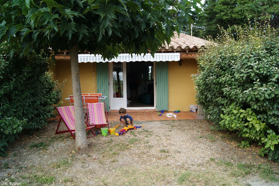 Rechts in dem Mobilhome lebte der Vater von Madame Blanc, der in tollstem Dialekt die tollsten Geschichten erzählen konnte, von denen ich nur die Hälfte verstand. Aber er war so lieb und ich musste an meinen Papa denken, der auch immer so aufgeschlossen war. Jedenfalls bot uns der nette Mensch sogar an, dass wir mit seinem Gartenschlauch unser Auto waschen sollten. Das war sicher nötig, denn der Weg war so staubig, aber es hätte nichts daran geändert, dass das Auto im Handumdrehen wieder so ausgesehen hätte.