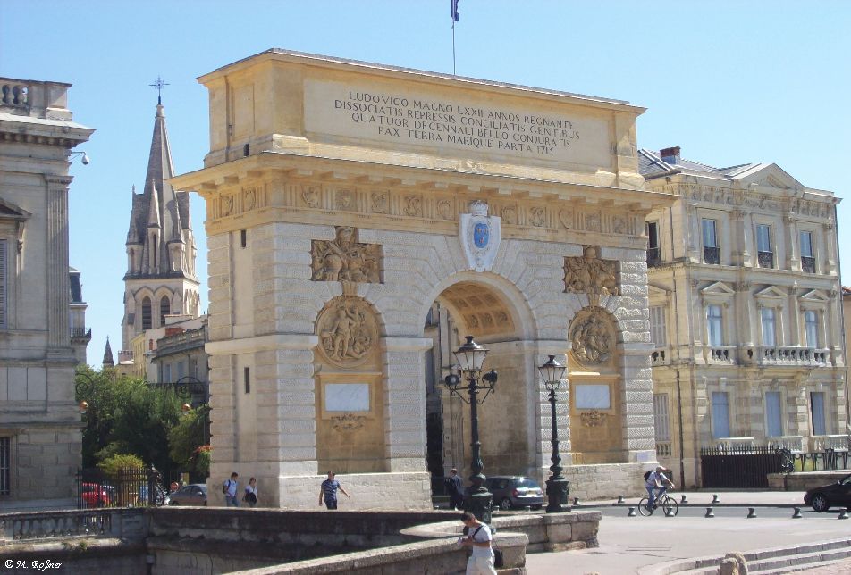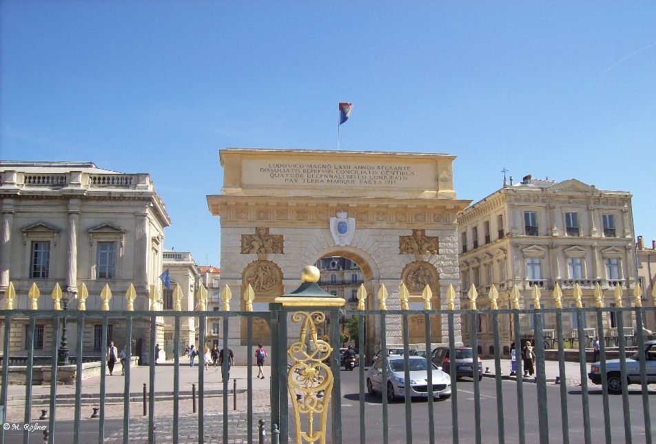 Dieser Triumphbogen ist gleichzeitig Eingang zum Park, früher war dort ein altes Tor mit Zugbrücke. Wegen Einsturzgefahr und auch zur Verschönerung wurde der Bogen mit der Brücke errichtet. Der Bogen, auch zu Ehren Ludwig des XIV errichtet, ist 15 m hoch und 18 m breit. Die Skulpturen zeigen auf der Peyrou-Seite "die Eroberung von Namur" und den "Sieg des Königs über die Koalition". Der König wird als Herkules dargestellt, der den Löwen (England) erlegt und einem Adler (Österreich) Angst macht. Auf der Stadtseite sieht man die Verbindung zweier Meere durch den Canal du Languedoc und die Widerrufung des Ediktes von Nantes.