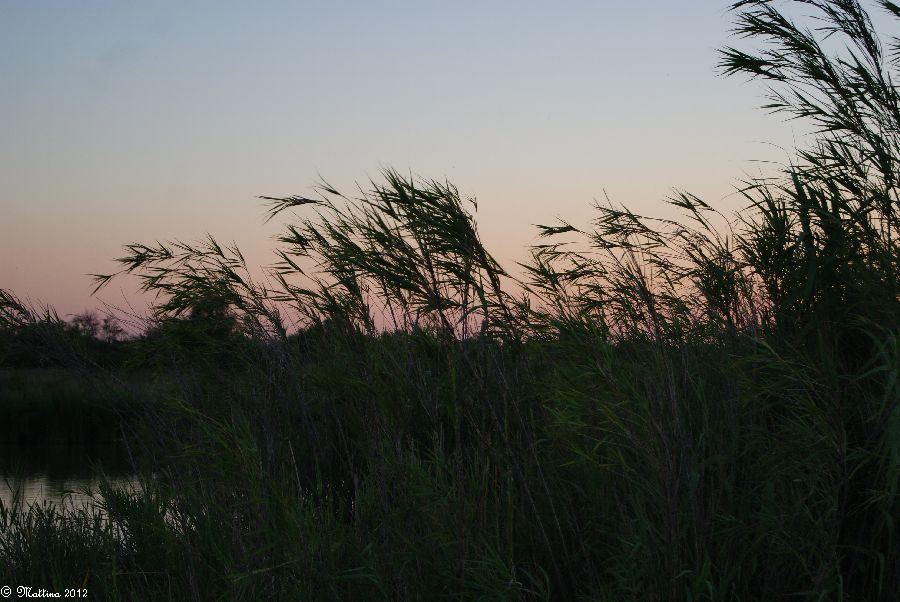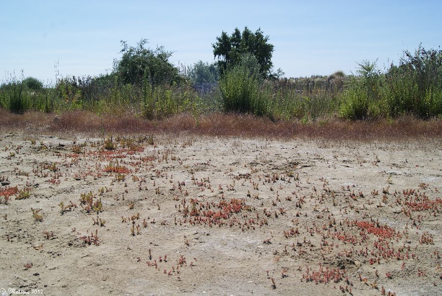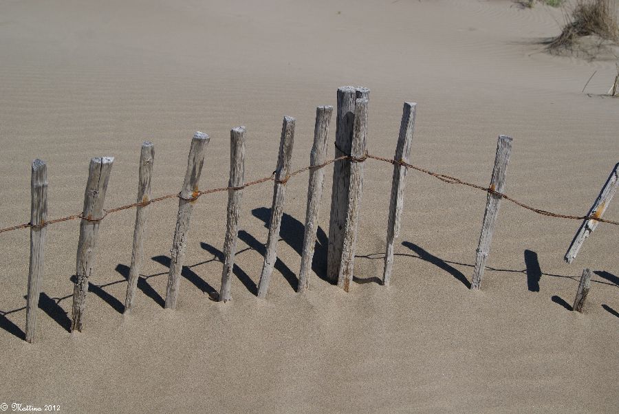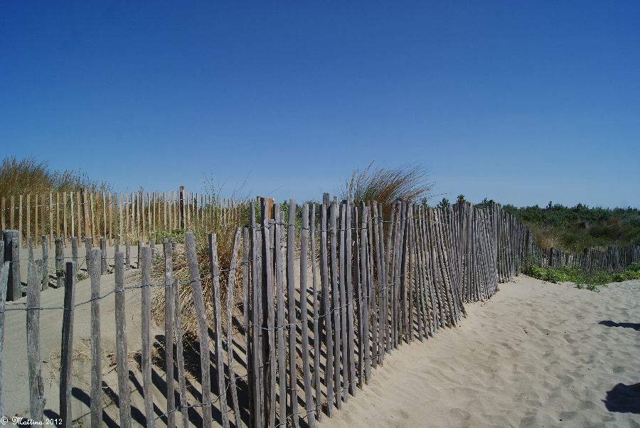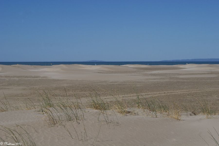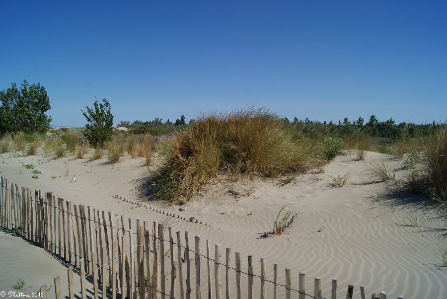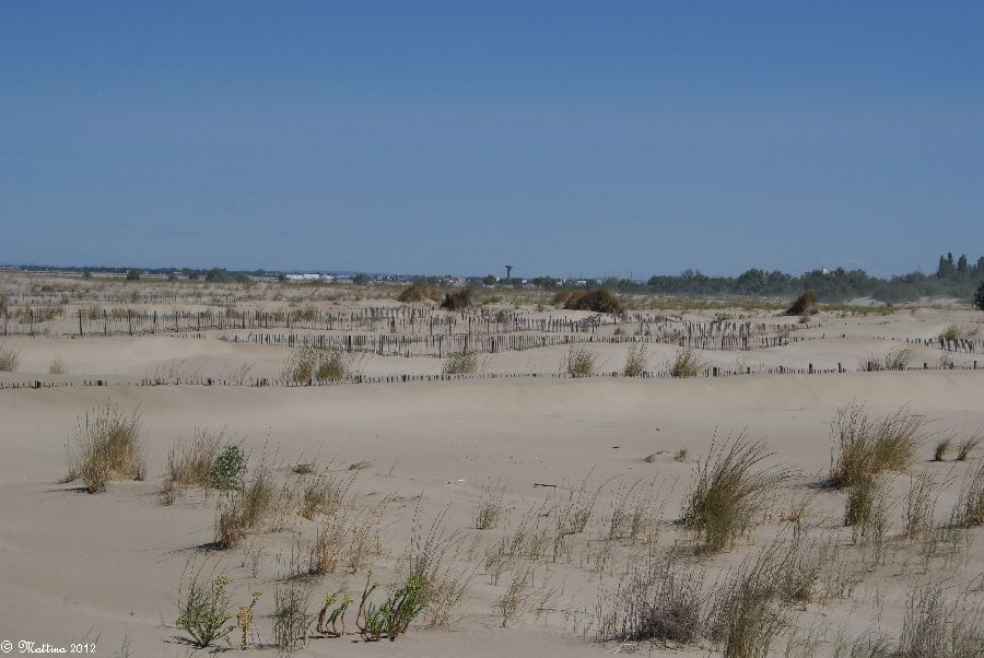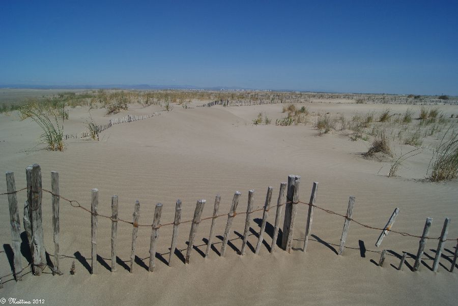 Am rechten Bildrand vor den Sträuchern kann man gut sehen, wie der Mistral den Sand vor sich her treibt...