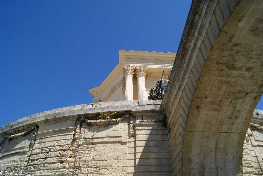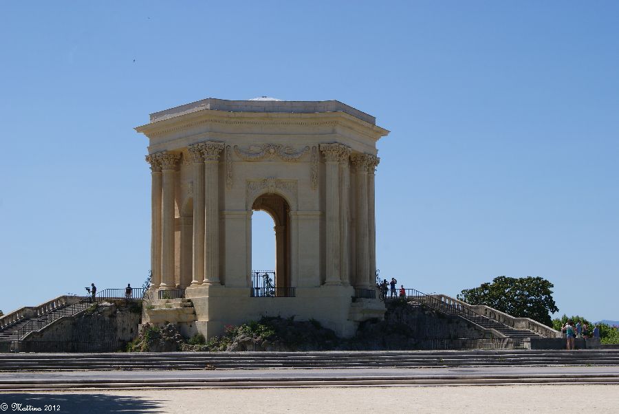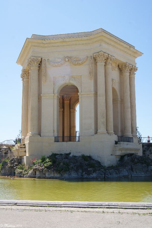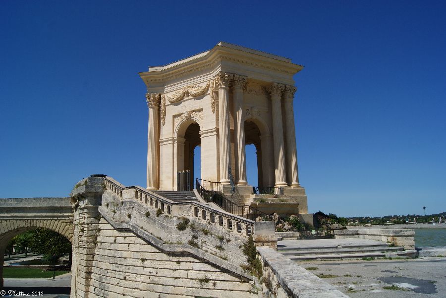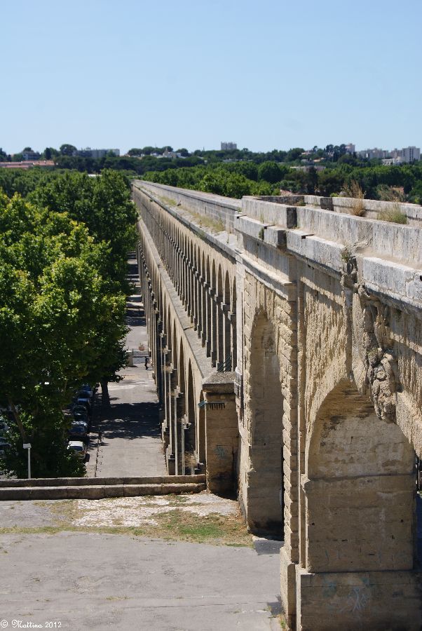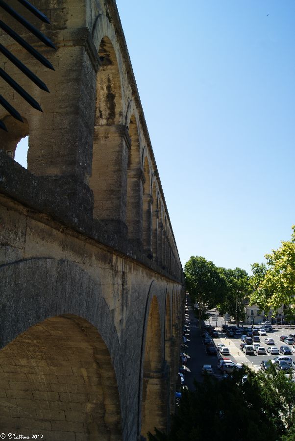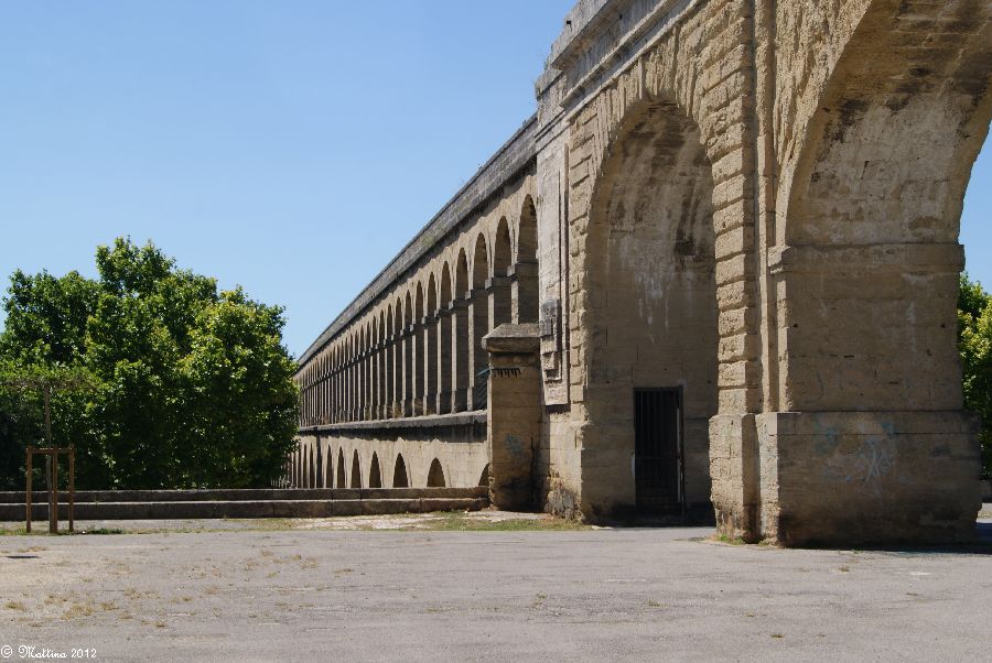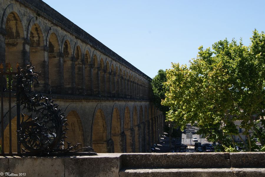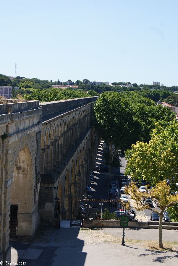 Das Aquädukt "Saint-Clément", leider kann man hier auch drauf. Es wurde 1772 fertiggestellt und diente zur Wasserversorgung der Stadt aus der 14 km entfernten Quelle. Am Ende steht das Chateau d'Eau von wo aus das Wasser zu verschiedenen Brunnen, u.a. zu dem an der Place de la Comédie, und Wasserversorgungsstellen weitergeleitet wurde. Das Aquädukt hat 51 große und 182 kleine Bögen, eine Länge von 880 Metern und eine Höhe von 22 Metern.