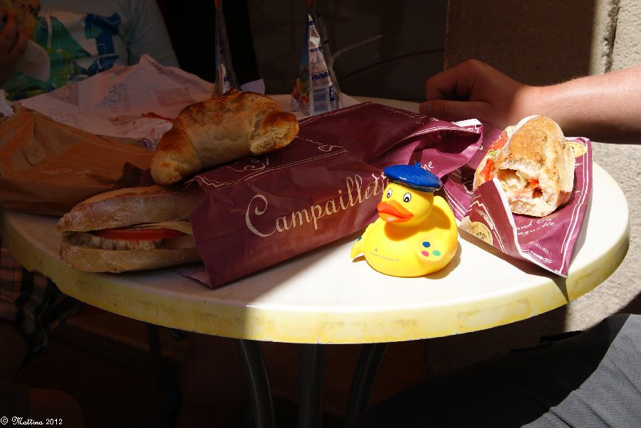 Unterwegs gönnen wir uns ein Sandwich, Claude isst mit.