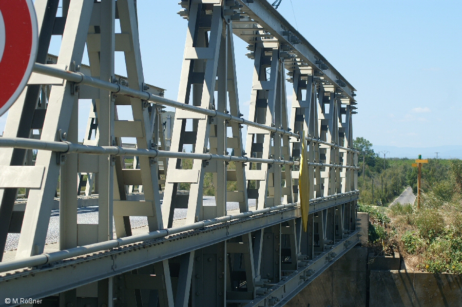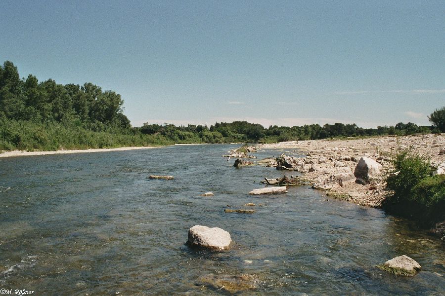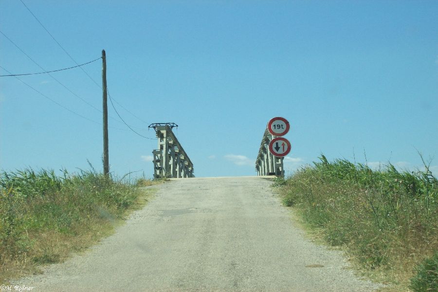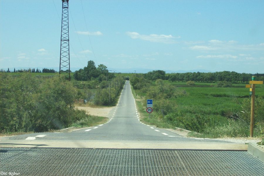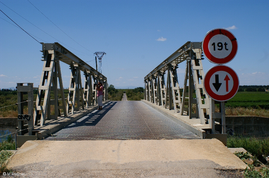 Dominique ist eingeschlafen, also macht es nicht viel Sinn in einem der Orte am Wegesrand anzuhalten um sie anzuschauen. Weiter geht es durch die Weinfelder des Costières de Nîmes, bis wir ein Schild mit der Aufschrift "Pont des Tourradons" sehen, wenn eine Brücke schon so ausgewiesen ist, muss sie wohl was Besonderes sein. Wir fahren also hin und es hat sich wirklich gelohnt. Kurz hinter der Brücke müssen wir zwar drehen aber sehenswert ist es allemal.