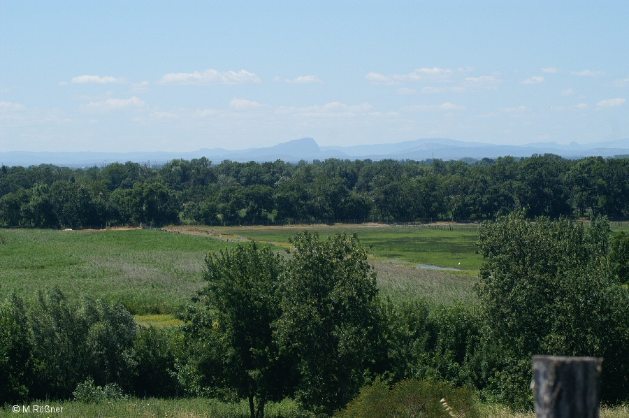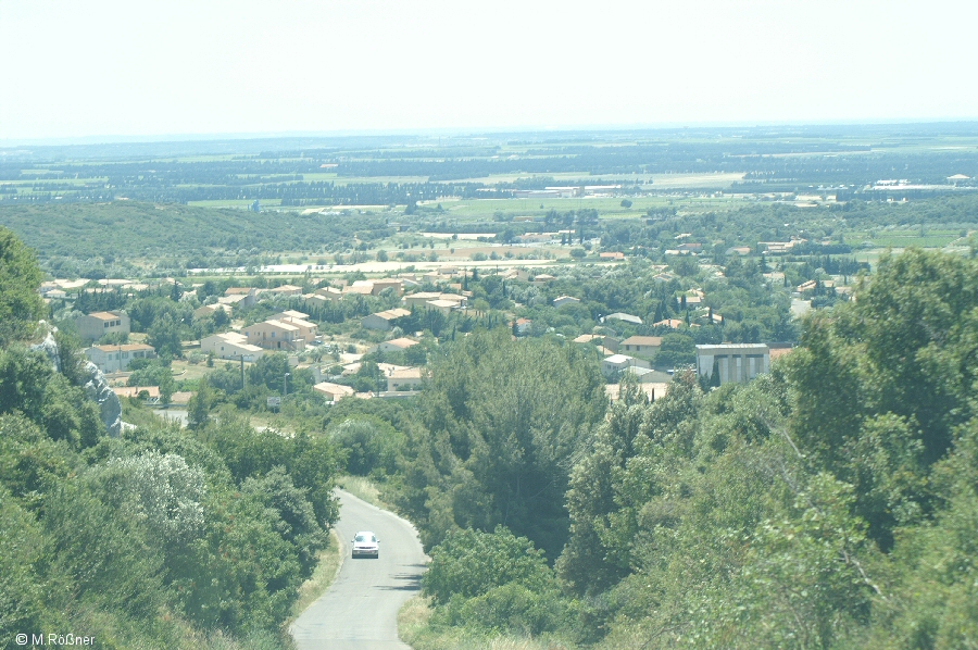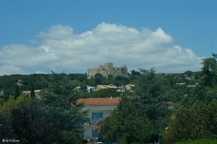 Wir werfen noch einen Blick auf die Werbetafel und machen uns dann auf den Weg, vorbei an der Burg in das vor uns liegende Tal in Richtung Nîmes.