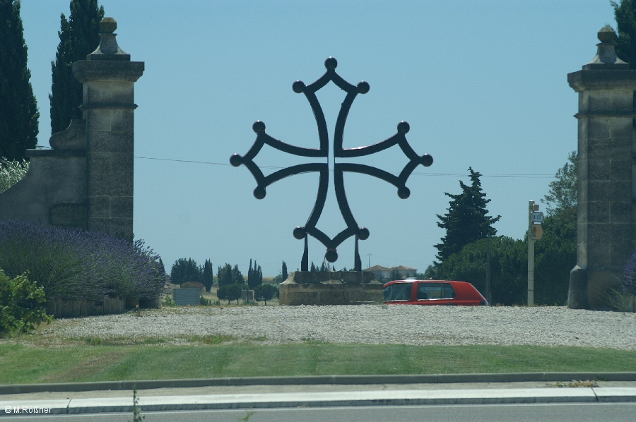Nîmes und der Berufsverkehr scheinen untrennbar verbunden zu sein, jedenfalls landen wir immer mittendrin. Der Hauptverkehrsstrom schiebt sich zwar außen herum, aber durch gefühlte 50 Kreisverkehre mit und ohne Ampel, und wir fahren bei dem unten abgebildeten Kreisel aus dem Strom der nach Hause eilenden raus und Richtung Aubord und Vauvert.