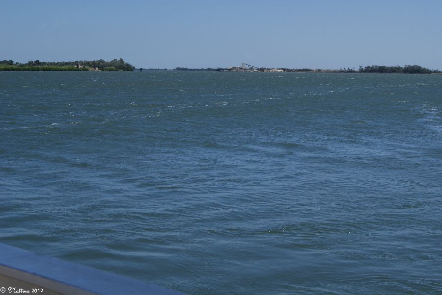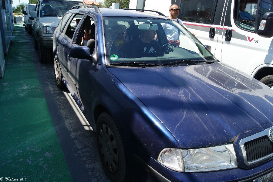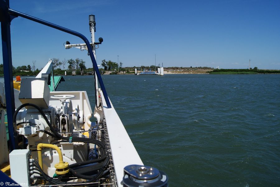 Zunächst mal stehen wir im Stau und wissen nicht, wann die Fähre kommt, wie viele Autos darauf passen und können auch nicht drehen. Also warten wir mal geduldig. Aber es dauert nicht allzu lange und wir können auf die wirklich große Fähre. Der Spaß kostet 5 Euro pro Auto.