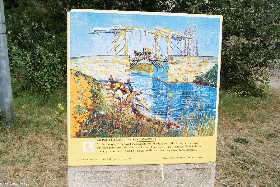 und so in Wirklichkeit. Allerdings steht die heutige Brücke nicht am Originalplatz. Denn dort, wo Van Gogh sie einst malte ist alles zugebaut. Diese Brücke wurde 1959 in Fos gebaut, 1962 hier aufgestellt und 1997 komplett restauriert. Zur Zeit Van Goghs gab es zwei dieser Holzbrücken über den Kanal.