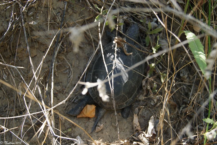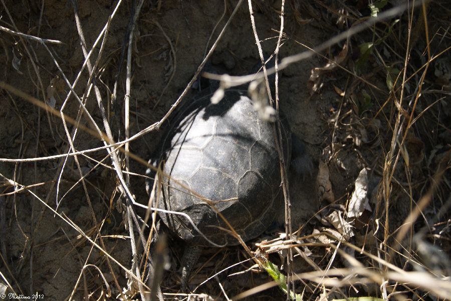 Von Arles aus geht es nun über bekanntes Terrain nach Hause, mitten auf unserem sandigen Weg zur Mas liegt ein völlig neuer Stein. Ralf wundert sich noch als ich es plötzlich erkenne und ihn zum Halten bringe. Es ist nämlich kein Stein sondern eine Schildkröte. Ich setze sie an den Rand, wo sie ihren Weg fortsetzen kann.