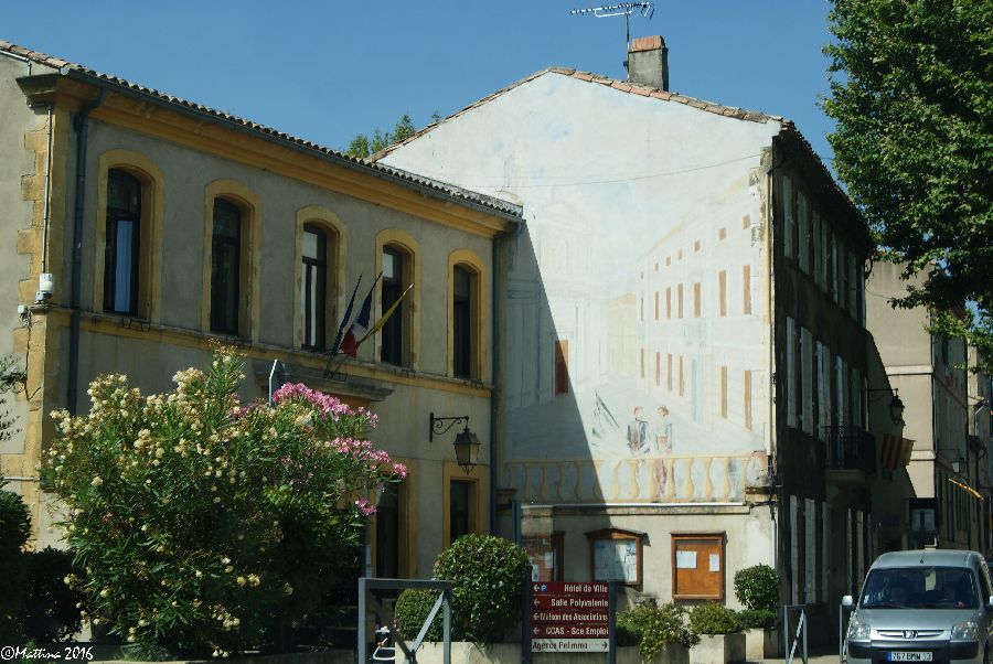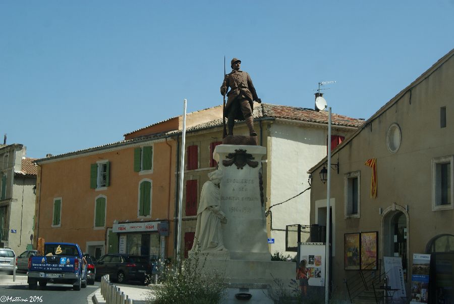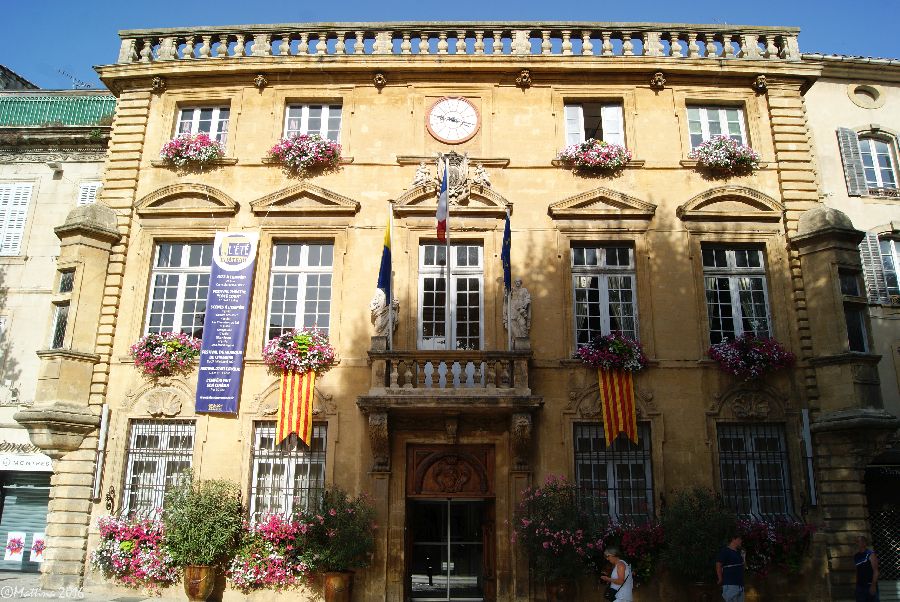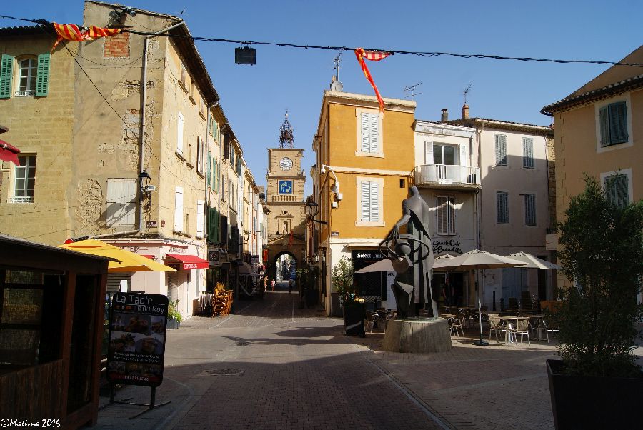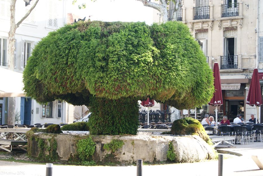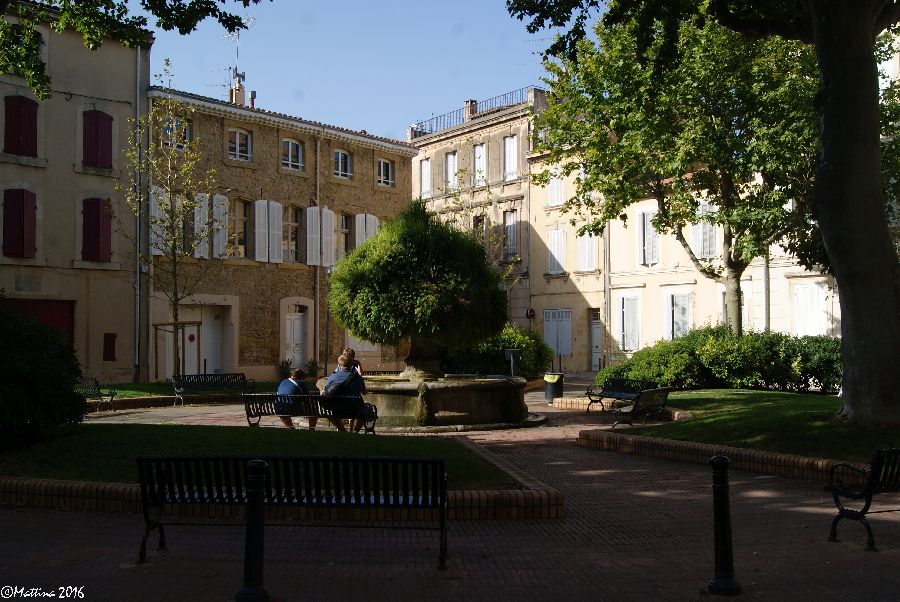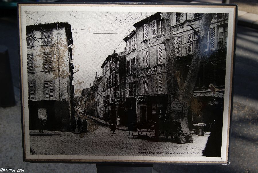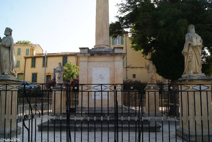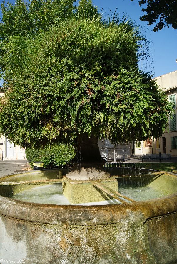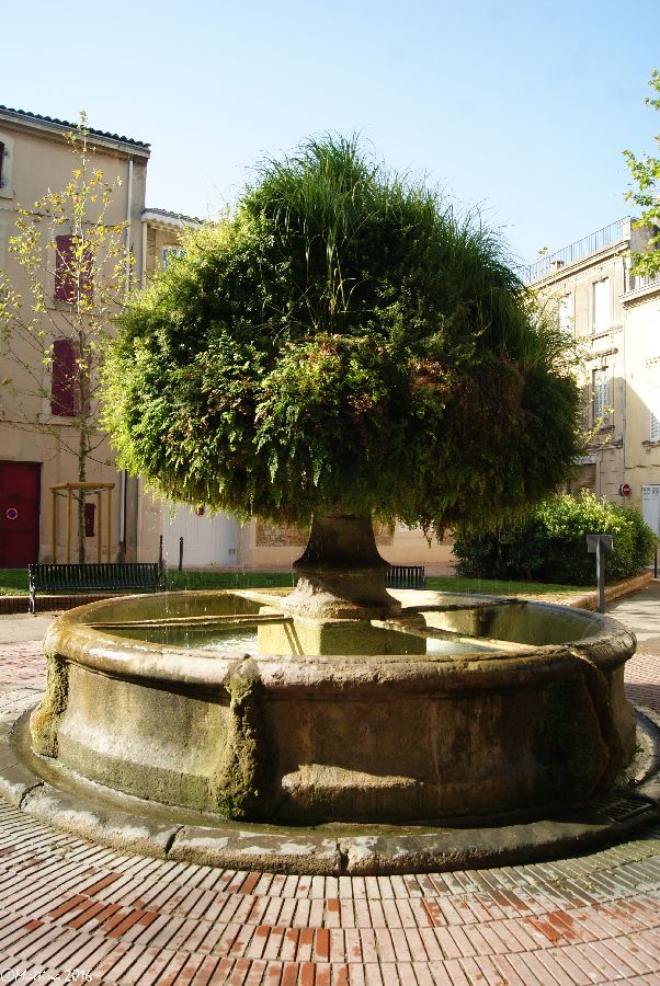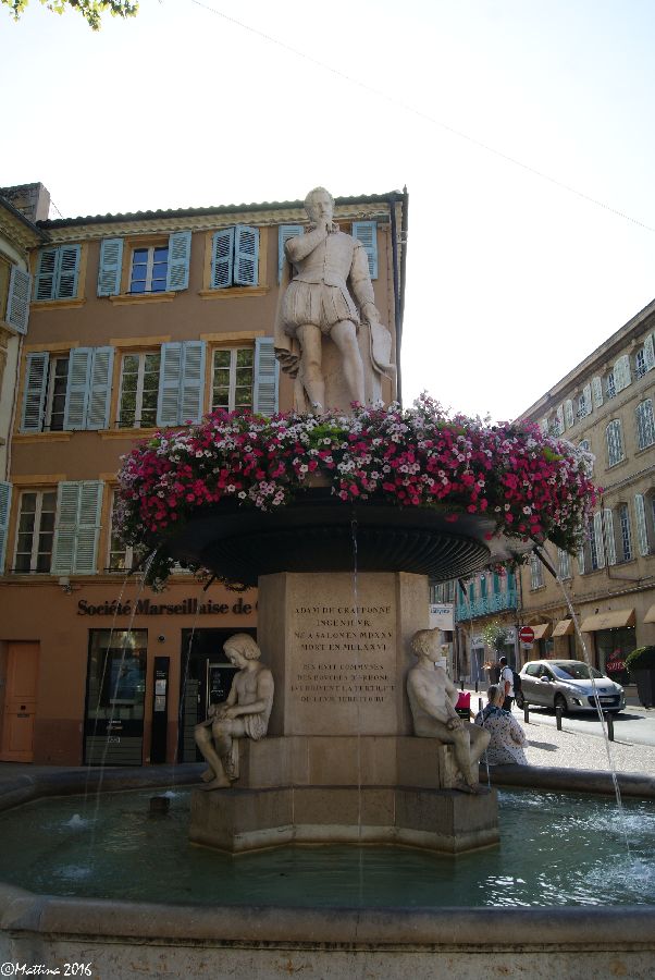 Gegenüber der Brunnen mit der Statue von Adam de Craponne, seines Zeichens Ingenieur und Erbauer des "Canal de Craponne" zur Bewässerung der Crau mit Wasser aus der Durance. Die Statue wird von vier Schutzgeistern eingerahmt und die Inschriften auf dem Sockel sind auf Provençal und Latein.