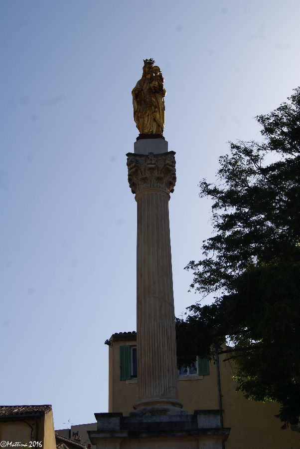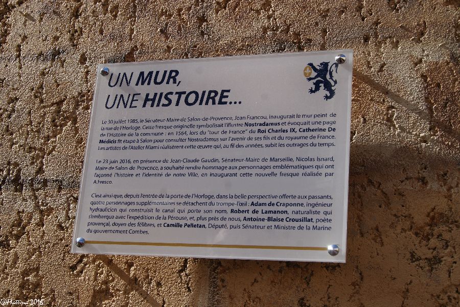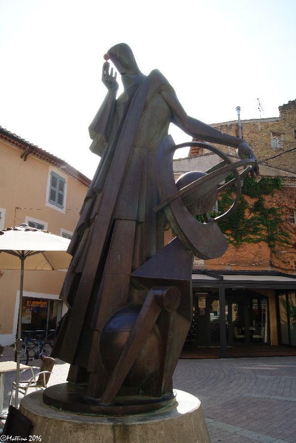 Mit dem gleichnamigen Denkmal. Michel de Nostradame, Nostradamus genannt, kam erst im Alter von 44 Jahren nach Salon de Provence, geboren wurde er in St. Rémy de Provence. In Salon schrieb er seine Prophezeiungen und blieb dort bis zu seinem Tod am 2. Juli 1566.