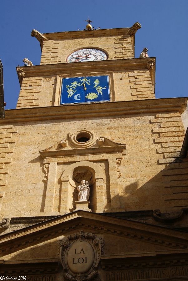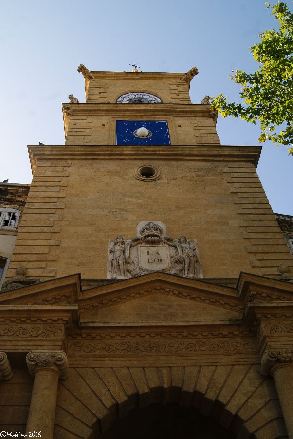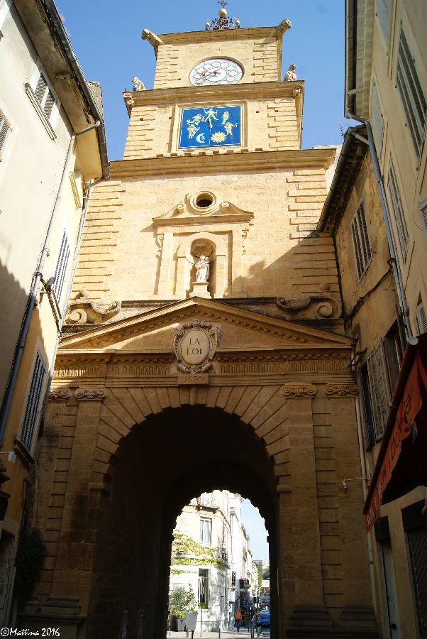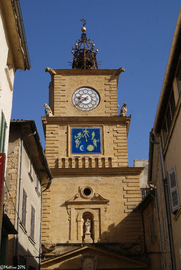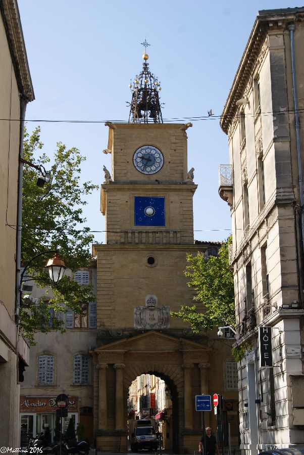 Bevor wir uns aber dem Uhrenturm zuwenden, finden wir links die Fontaine Moussue, das Wahrzeichen der Stadt. Der Brunnen, inzwischen komplett von Moos bedeckt, besteht auch aus zwei Ebenen. Er wurde 1775 von dem Bildhauer Maurice Bernus errichtet.