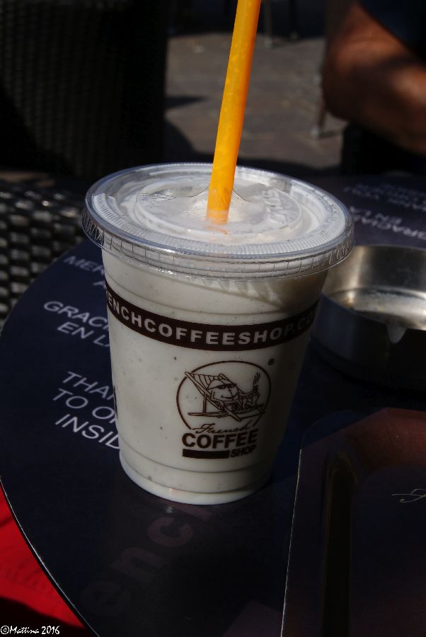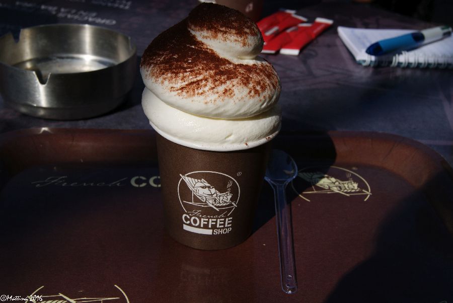 Der Macchiato sieht lustig aus mit seinem Sahneberg, ist schwierig zu trinken, aber schmeckt lecker, ebenso wie der Milchshake.