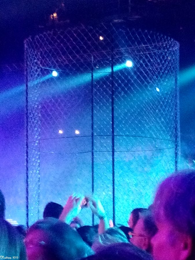 Wir reihen uns ein und warten geduldig mit allen anderen, obwohl vorher schon ein Konzert stattfindet werden die Türen pünktlich geöffnet, es geht langsam aber ohne Gedrängel. Vorne sehen wir die Hinterlassenschaften der Wartenden, Decken, Stühle, alles mögliche wurde hier einfach stehen gelassen. Na ja vielleicht nehmen die Leute nach dem Konzert ihren Kram ja wieder mit...? Wir wissen es nicht. Flaschen darf man nicht mit rein nehmen oder nur ohne Verschluss. Als wir vorne sind, kommt erst mal der Schock, über dem Eingang vor dem wir stehen steht "keine E-Tickets" aber die Damen hinter uns haben auch welche und so sind wir beruhigt. Es wäre ja auch echt blöde wenn bei den Menschenmassen auch noch danach sortiert würde... Wir kommen rein und laufen leider in die falsche Richtung. Die Plätze sind zwar gut, aber auf der falschen Seite der Bühne. Wir stehen links und alles spielt sich rechts ab. Aber es gibt ja noch die großen Videowände.